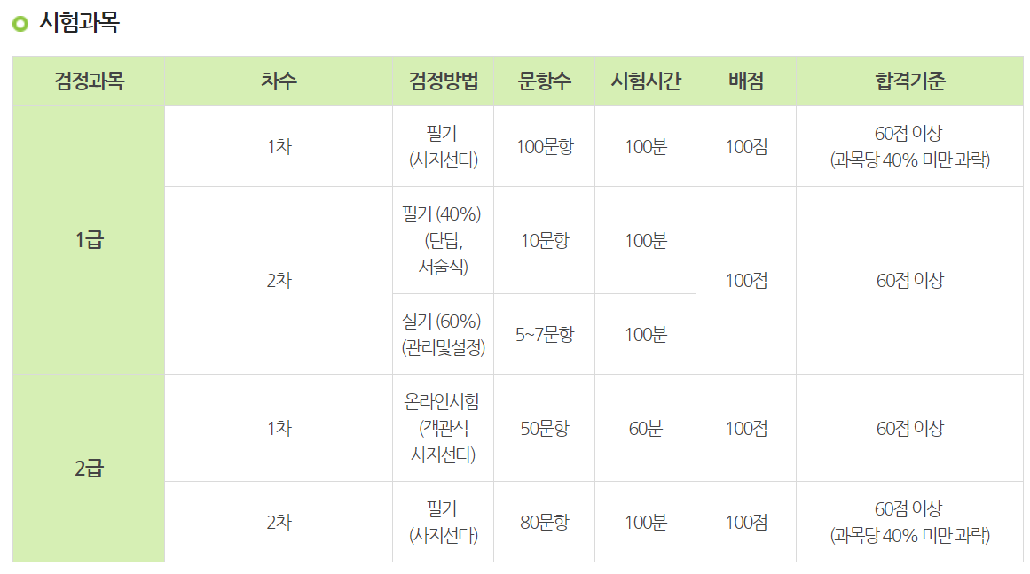리눅스마스터는 1급과 2급으로 나뉘어져 있으며, 1급, 2급도 아래와 같이 1차, 2차로 나뉘어진다.
